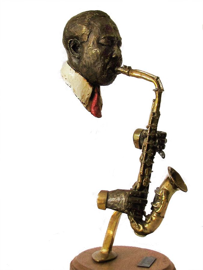 "Jazz: An American Art Form". This series depicts the evolution of jazz music from its roots in Africa to the contemporary superstars of the jazz era, and focuses on this style as a pure American musical idiom. Elements of the Jazz series are on display at major galleries and museums throughout the U.S. and has received critical acceptance internationally. This series of over 70 bronzes features many works focusing on the African tribal contributions, then presents such great jazz performers as Duke Ellington, Miles Davis, Charlie Parker, Louis "Satchmo" Armstrong, Ella Fitzgerald, Fats Waller and Benny Goodman.