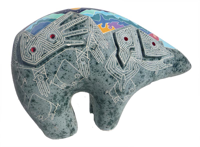 For 21 years, Gene and Rebecca Tobey worked together as husband and wife and artistic partners. Having created a distinctive style and a unique artistic signature, the Tobey design is instantly recognizable. Best known for their creations of ceramic and bronze sculptures of abstracted animal forms, bear, buffalo, elk and other majestic animals stand in dynamic, timeless attitudes. Layered in symbols, each sculpture becomes a story within a story to be read and explored time and time again by the viewer. Each piece is a sculptural statement about the dominant personality of the animal, and magic occurs as the sculpture's surface becomes a canvas upon which the Tobeys have carved, drawn, painted and scratched sgraffito drawings of other animals, human figures, scenes of starry night skies, mountain ranges, and symbols and geometric shapes. Beautifully patinated surfaces lend depth and color to the sculpture.