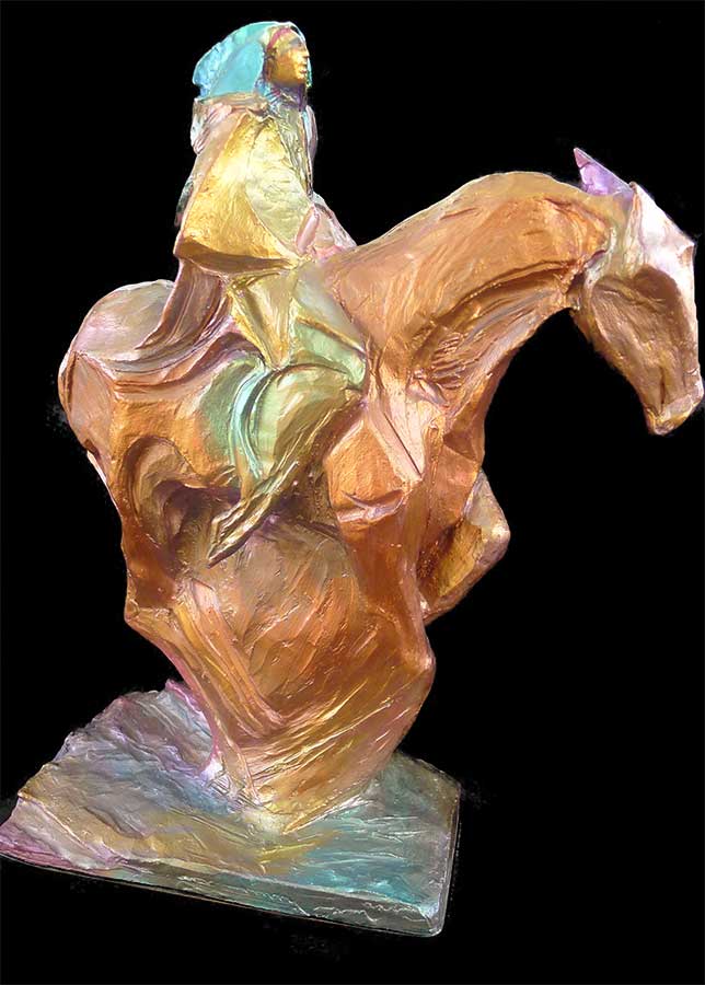 (1931- 1997) was born in Denver, CO. He is celebrated for his strong use of colorful abstract shape which often refer to bits of the culture of New Mexico. Working primarily in acrylics, Vigil seeks to show motion as well as emotion in his paintings. Vigil sometimes uses watercolor as a medium in which to sketch out ideas for larger paintings. Other mixed media that he uses include gouache, cast paper, and bronze. Lately, Vigil has been enjoying making sculpture and likes to work on several projects at one time. Vigil was born during the Depression in 1931 to very young parents working in the sugar beet fields of Colorado. The first art that he remembers seeing was in the Catholic church. He began to take an interest in art during high school and later joined the Marine Corps. With the help of the G.I. Bill, Vigil attended the Denver Art Academy and the Colorado Institute of Art. He worked for a greeting card company upon graduation where Vigil only had time to paint on Sundays. He began to enter nation competitions and won the Winsloe Homer Memorial Award. Eventually Vigil was able to own his own gallery and produce his artwork full time. His two sons have followed in his footsteps. For the last part of his life he lived and worked in Taos, NM